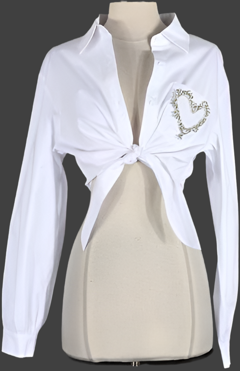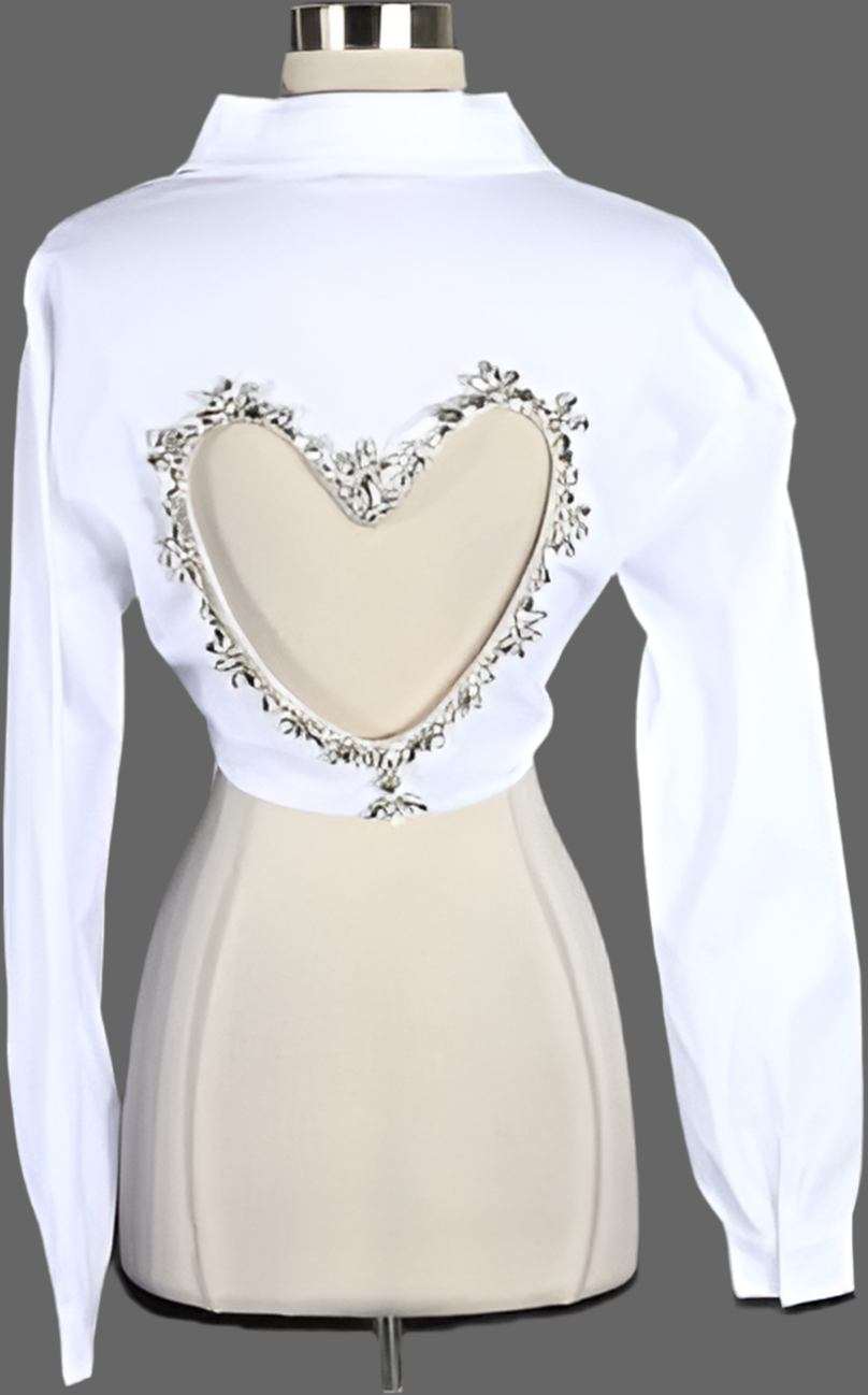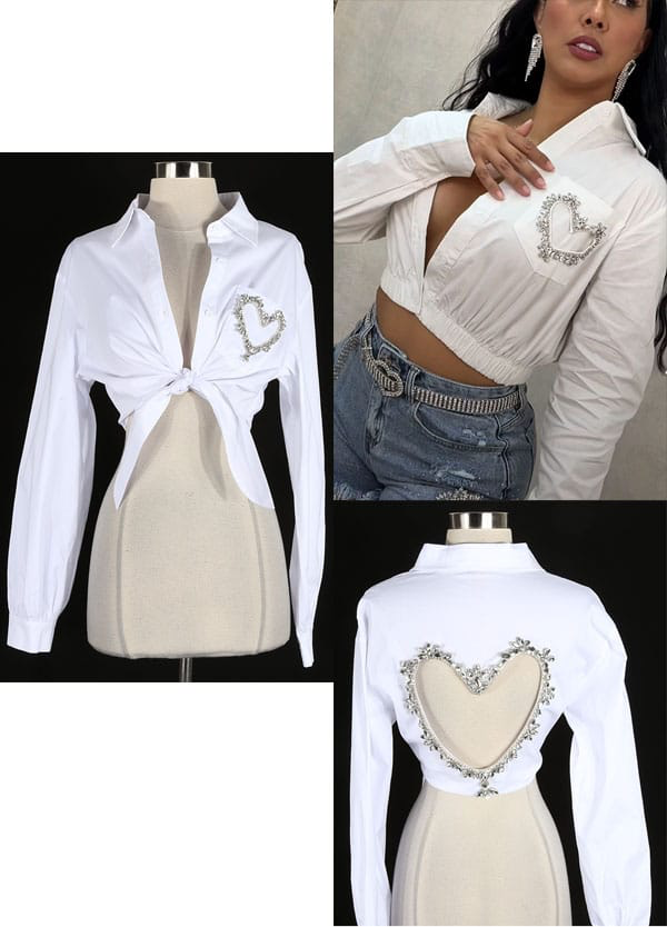 White Rhinestone Heart Cropped Shirt – Long Sleeve Button-Up