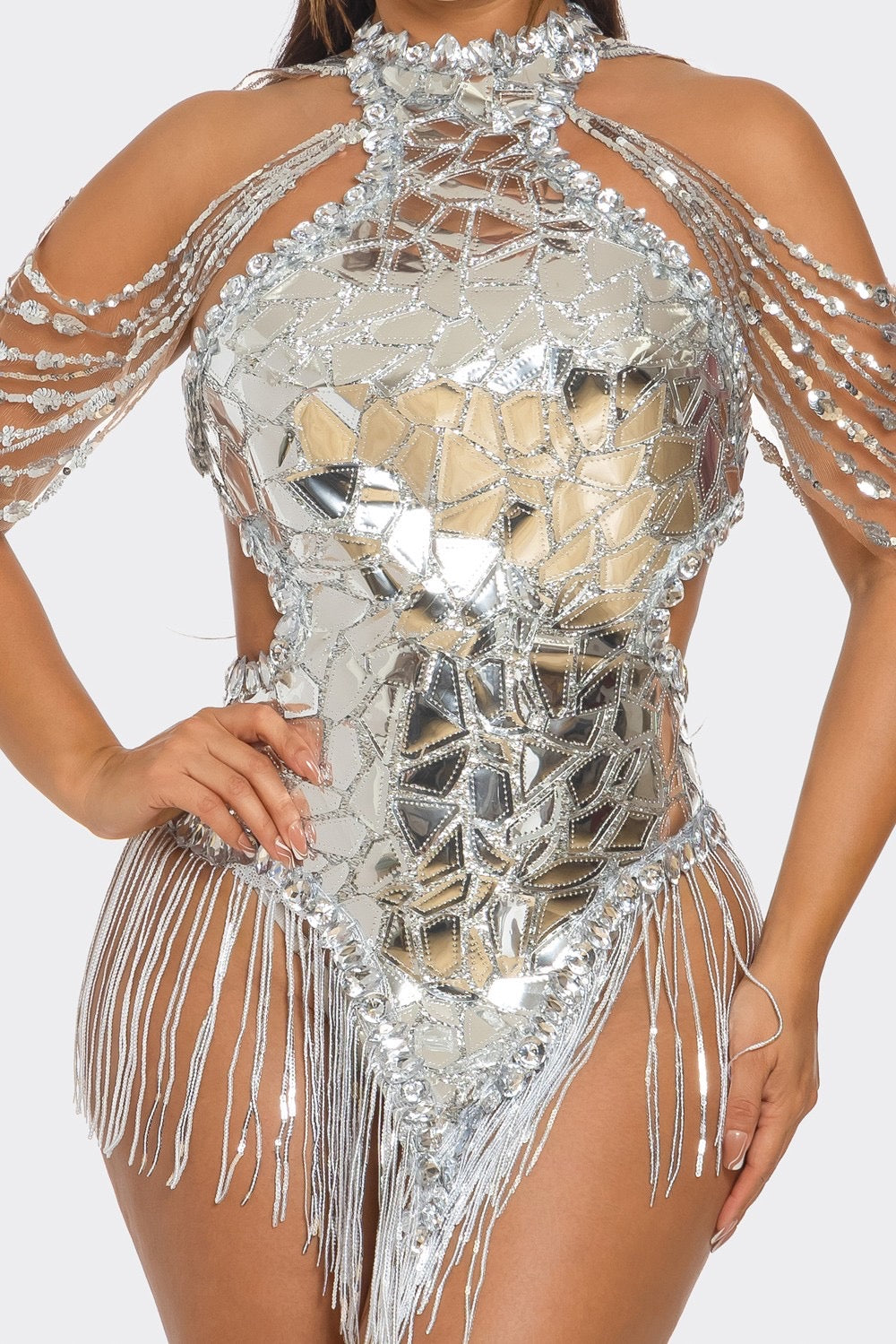 Backless Mirror Sequin Dress - Silver Stage Costume for Nightclub, Rave & Drag Shows