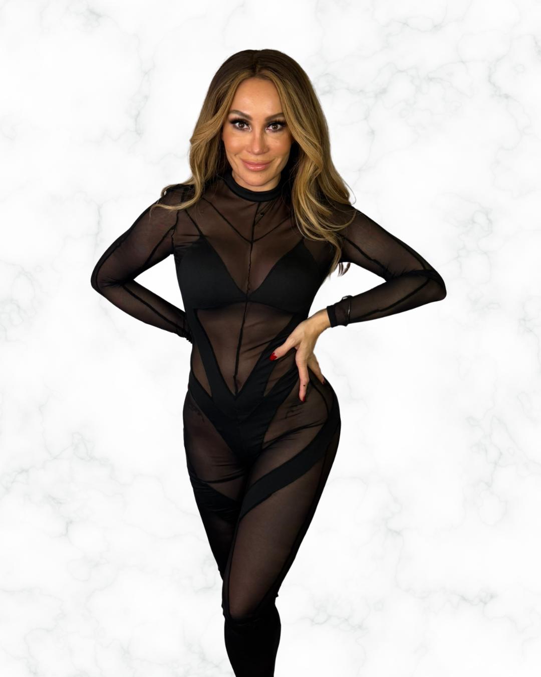 Dare to be bold in this Black Sheer Mesh Long Sleeve Jumpsuit – a seductive and statement-making outfit designed for fearless women. This jumpsuit features: