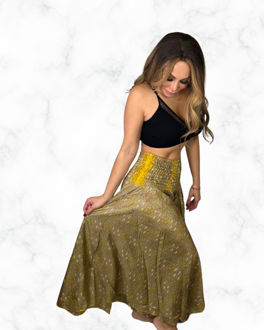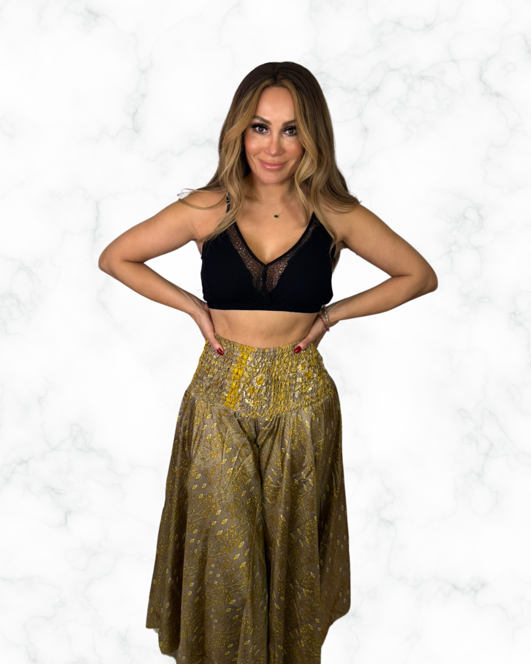 Add a touch of elegance and comfort to your wardrobe with these Golden Boho Wide-Leg Palazzo Pants, a perfect balance of sophistication and effortless style. These flowy pants feature: