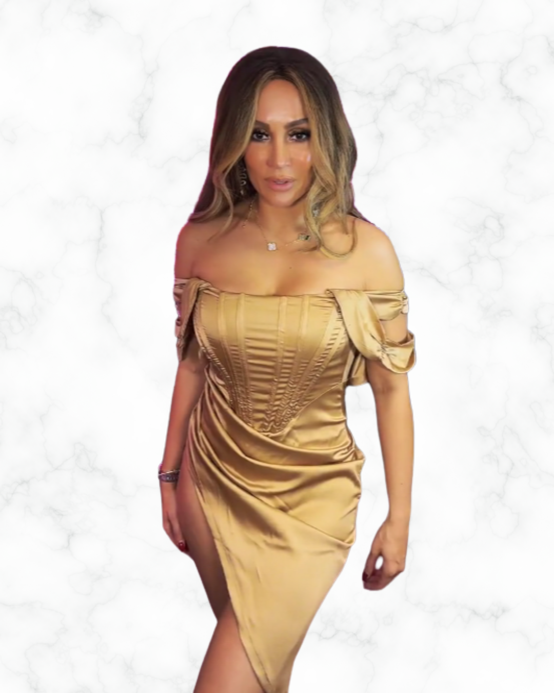 Golden Goddess Dress – Off-Shoulder Satin Corset Gown