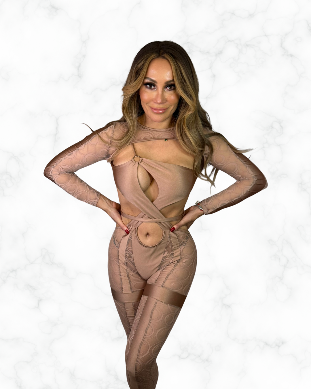 Make a bold statement with this Nude Sheer Cutout Two-Piece Jumpsuit – a sultry and high-fashion ensemble designed for trendsetters. This unique set features: